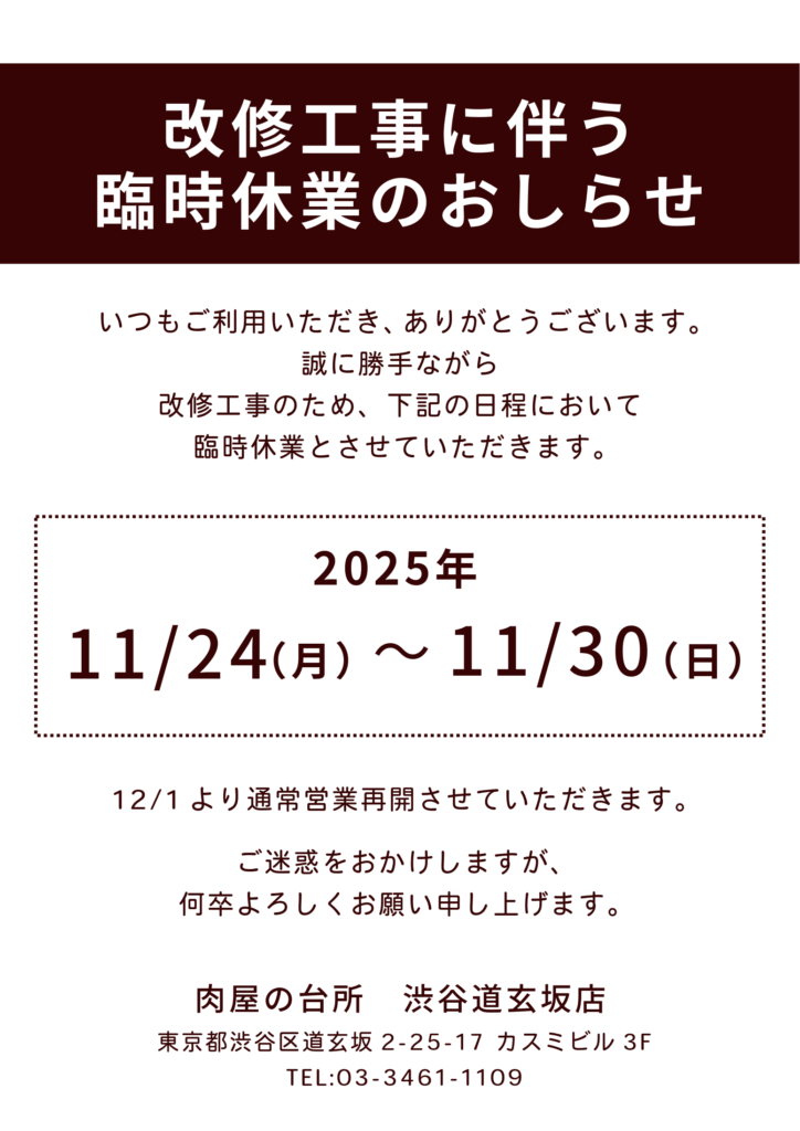 渋谷道玄坂店 店舗改修工事に伴う一時休業のお知らせ 2025 11/25 Uncategorized お知らせ 関連商品 【肉の日救済企画】先着に漏れたお客様へ飯田橋店限定で和牛食べ放題3,939円をご提供! 【インタビュー記事】コロナ禍で店を守り抜いた23歳店長、現代表芦澤慶「続ける覚悟と逃げる判断」 【25年10月29日開催】大好評肉の日企画!最高級神戸牛と松阪牛が1人前298円! 【25年秋冬新メニュー】右手で和牛焼肉、左手で和牛もつ鍋の新体験?! 【お知らせ】アサヒ社製品の一部提供について 【25年9月29日開催】最高級神戸牛と松阪牛が1人前298円!大赤字の肉の日! 2025年9月16日(火)社内研修に伴う全店休業のお知らせ 和牛食べ放題2929円!肉の日キャンペーン! (2025年8月29日開催) コメント コメントする コメントをキャンセルコメント ※ 名前 ※ メール ※ サイト 次回のコメントで使用するためブラウザーに自分の名前、メールアドレス、サイトを保存する。
